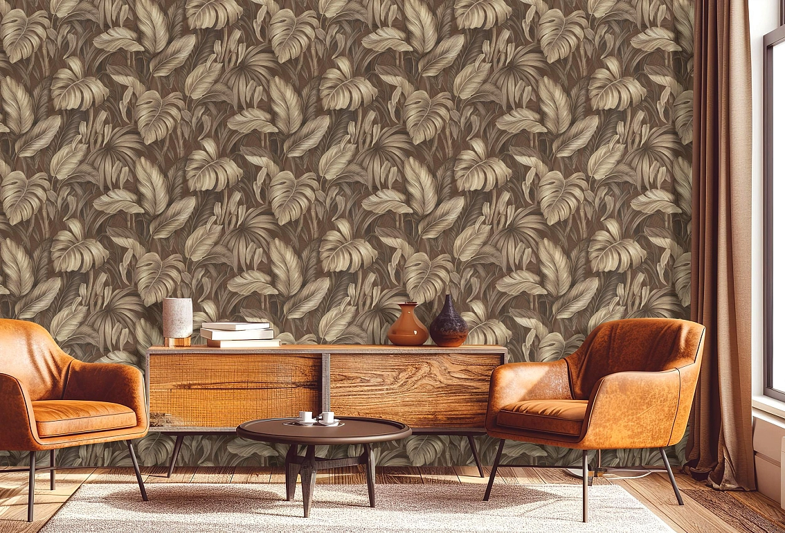 Золотой цвет обоев придает им элегантность и роскошь, а стильный флористический узор с листьями Voyage добавляет интерьеру особого шарма. Раппорт в 64 делает рисунок обоев гармоничным и естественным, придавая стенам оригинальный вид.